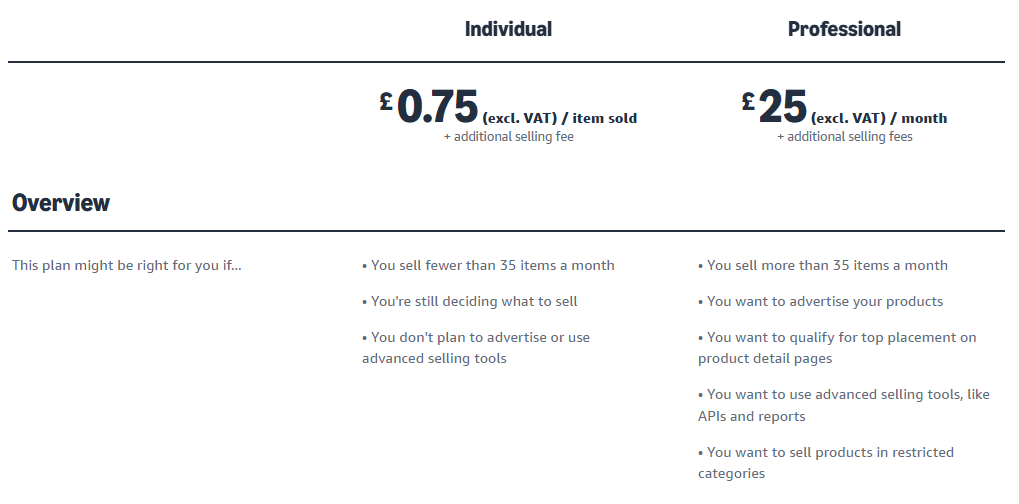 - Subscription fees: With the Professional plan, you’ll pay a flat £25 per month and no per-item fee. With the Individual plan, there’s no monthly subscription, but you’ll pay 75p for each item sold.