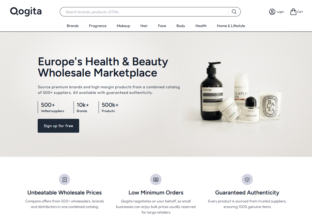Qogita is one of the strongest options in Europe. It’s a wholesale marketplace that brings together more than 500 suppliers offering premium brand products with guaranteed authenticity. Small businesses can take advantage of low minimum order quantities, which means you can test products without taking on too much risk.