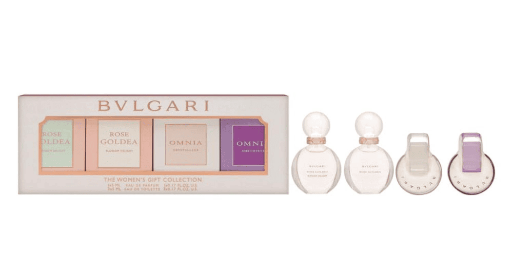 This luxurious set includes four miniature fragrances (5ml each): Rose Goldea Blossom Delight EDP, Rose Goldea Blossom Delight EDT, Omnia Crystalline EDP, and Omnia Amethyst EDT.
