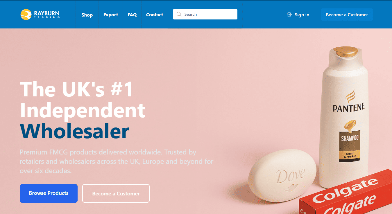 Based in Manchester, Rayburn Trading is one of the largest independent wholesalers in the UK. They stock more than 5,000 product lines from major global brands such as Unilever, Procter & Gamble, and Nestlé. This makes them a strong option for convenience stores, discount retailers, and high-volume online sellers.
